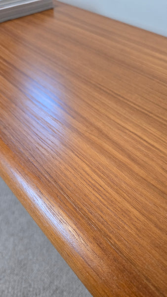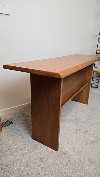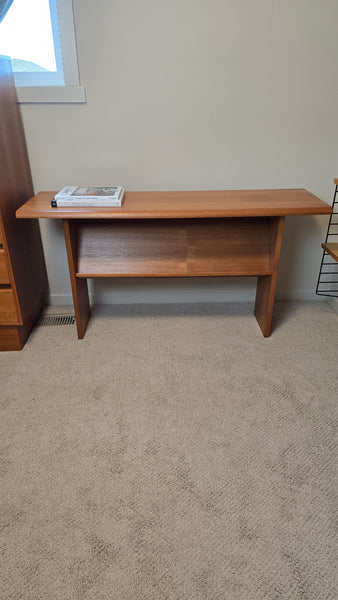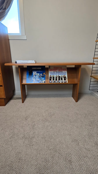Danish modern Teak console table with slant shelf magazine rack. Made in Denmark by Jesper.