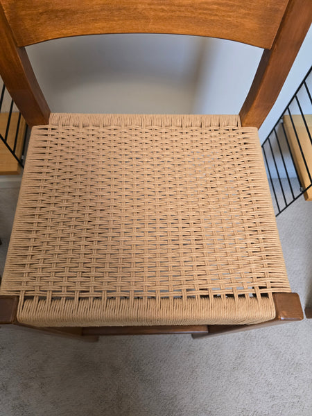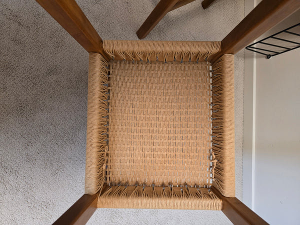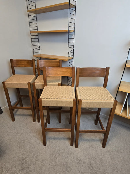 A set of four Danish paper cord bar stools. Solid stained wood, not Teak but Teak toned.