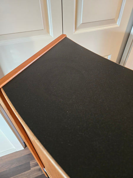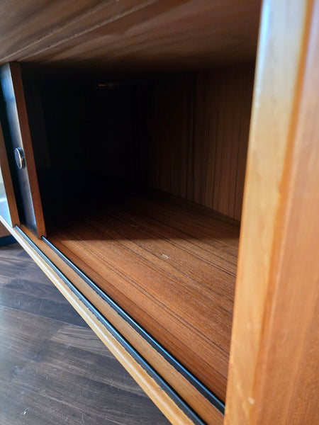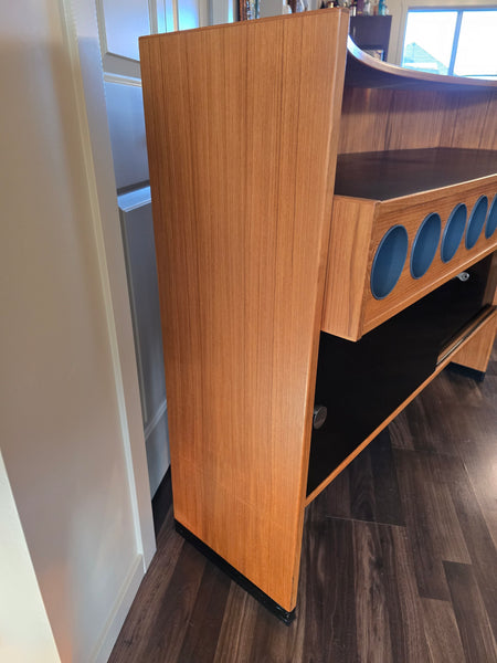 Large lower cabinet with sliding bypass doors. There is a push lock & key, however the lock doesn't seem to latch when it is pushed in. Storage for horizontal bottles and two dovetailed drawers with steel flip pulls.