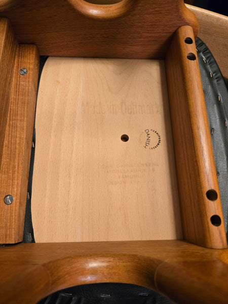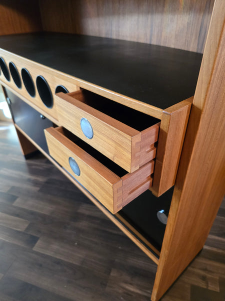 Dyrlund Teak 'Boomerang' bar with a pair of Christian Christensens bar stools, both designed by Erik Buck (Buch) and Made in Denmark.