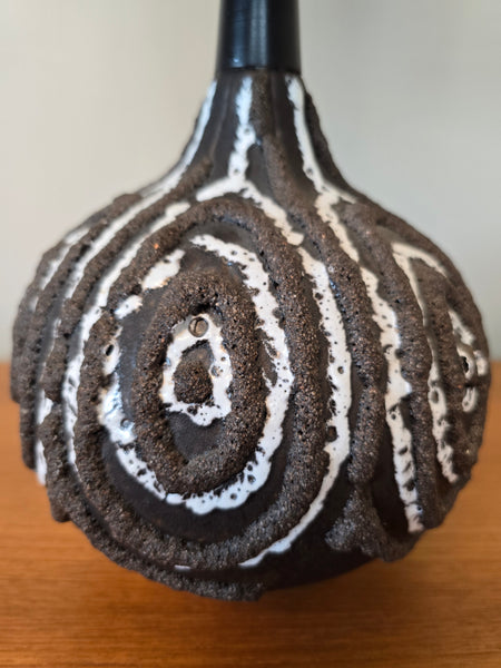Maurice Chalvignac fat lava table lamp. Dark, rich chocolate brown and white fat lava glaze in a graphic pattern.