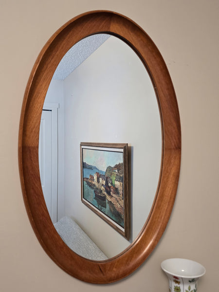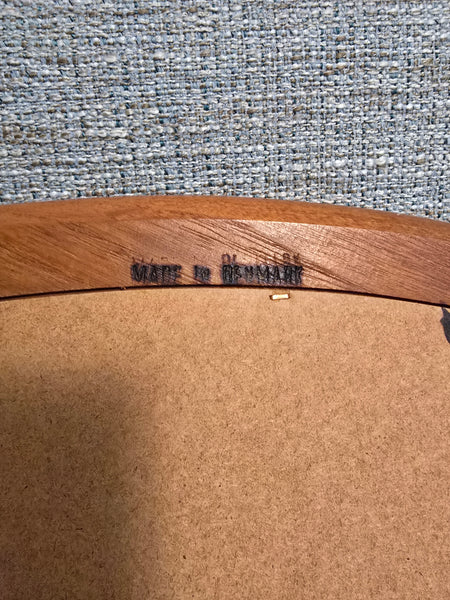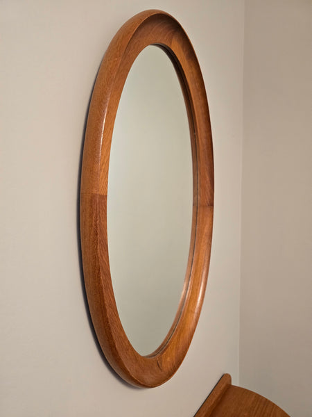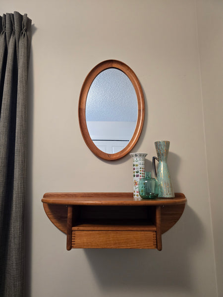 Kai Kristiansen for Vildbjerg, Denmark, solid teak entryway shelf with dovetailed drawer and an oval solid Teak mirror stamped Made in Denmark on reverse.