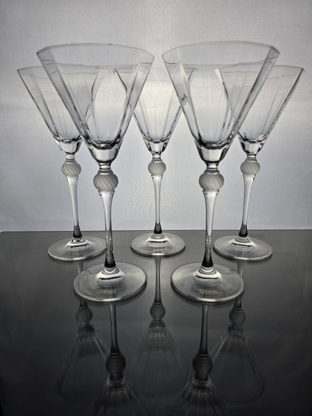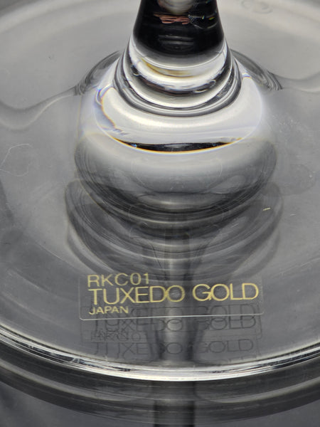 This are really stunning crystal glasses. Oscar de la Renta Tuxedo Gold (1990-1994). They are tall at over 8" with delicate clear crystal with a gold rim and a frosted ball in the stem.