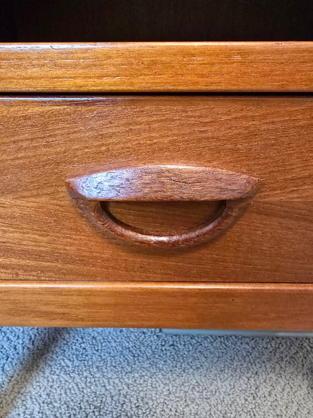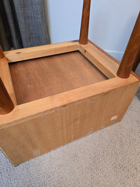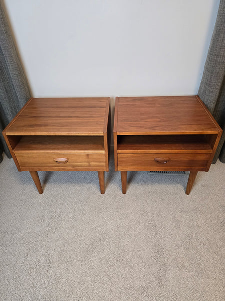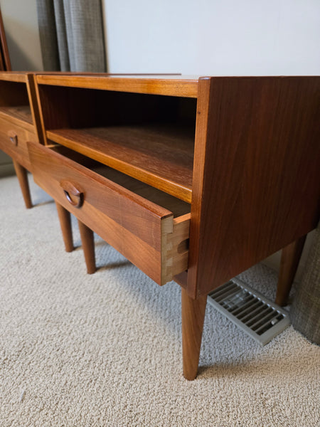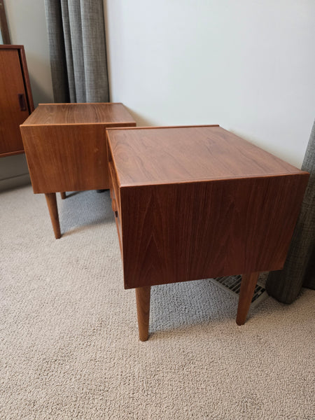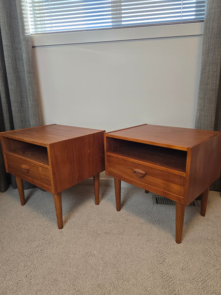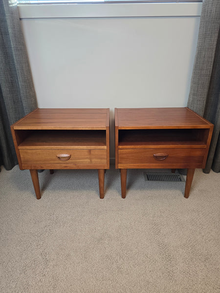 A gorgeous pair of Danish Teak Nightstands. Attributed to Kai Kristiansen for FM online but I can't find images with makers mark intact to confirm. In great vintage condition! Dovetailed drawer.