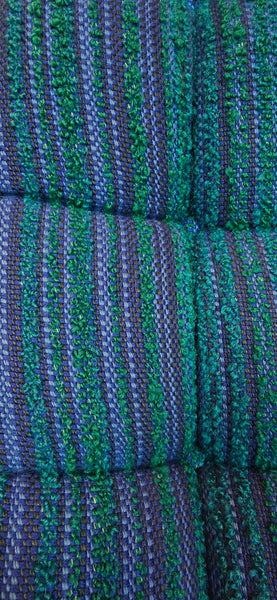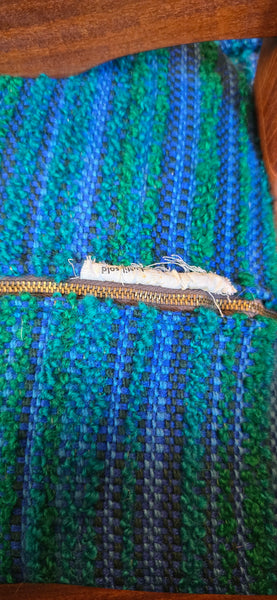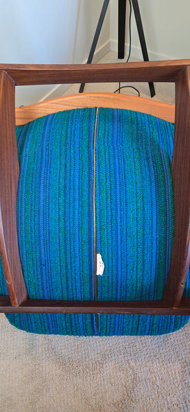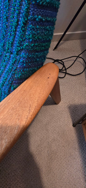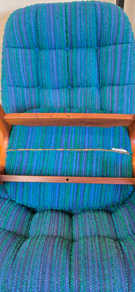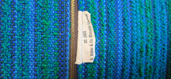 Gorgeous R. Huber scoop armchair and ottoman in the original fabric! A stunning and still vivid teal and blue wool with boucle. It can read a little purple in some light. This chair appears hardly used other than for decor. Foam is in great condition! No missing buttons. The joints are tight and no cracks. Retains original 1969 tags.